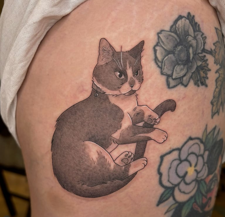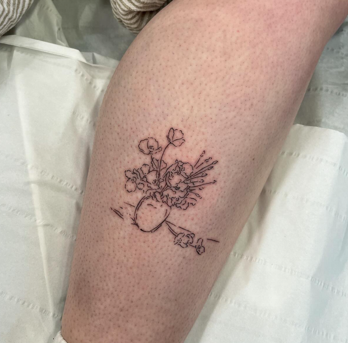 Fineline black & grey botanicals, old and modern classic tattoos.